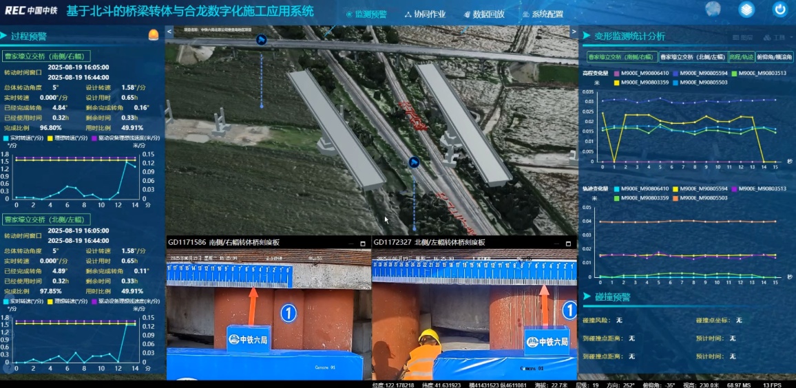该系统平台包含低延迟通信系统、协同作业软件功能模块、变形超限预警软件功能模块、态势显示软件等功能模块,实现了转体施工全流程的智能可视化,该系统能对转体角度进行精准到0.1度的实时追踪,对转速实施毫秒级演示。