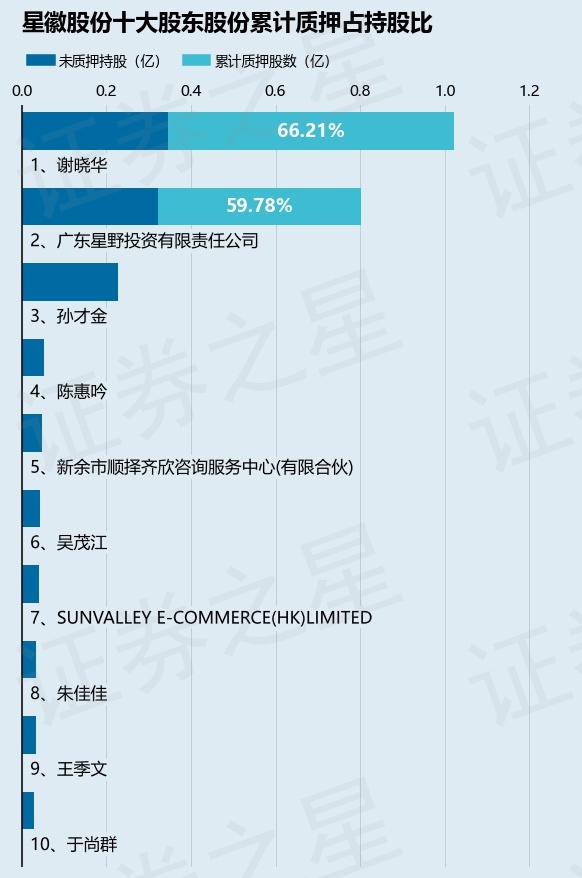 截止本公告日,股东谢晓华已累计质押股份6770.0万股,占其持股总数的66.21%,股东广东星野投资有限责任公司已累计质押股份4790.0万股,占其持股总数的59.78%。本次质押后星徽股份十大股东的累计质押股份占持股比例(占持股比例的计算以公司最新一期财务报表公布的十大股东的持股总数为基准)见下图: